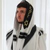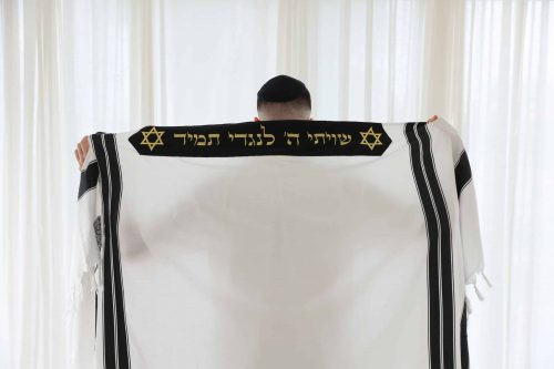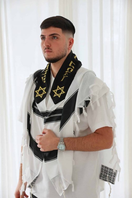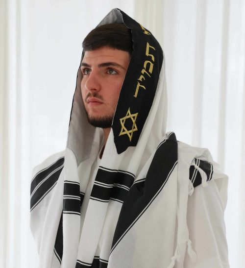 - טלית יוקרתית מבד תשבץ למניעת החלקה כולל רקמה אישית.