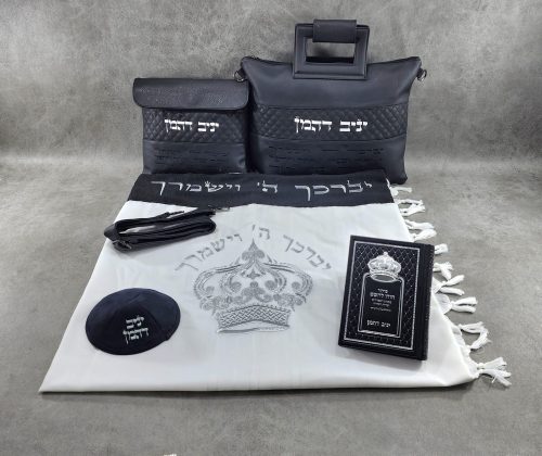 - טלית חתנים מהודרת מבד תשבץ מונע החלקה עם פסים עדינים בגוון כסף + רקמת כתר + רקמת יברכך ה' וישמרך ורקמה אישית.